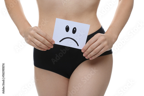 STD (sexually transmitted disease). Woman holding sticky note with drawn sad face on white background, closeup