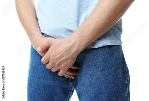 STD (sexually transmitted diseases). Man suffering from symptoms on white background, closeup