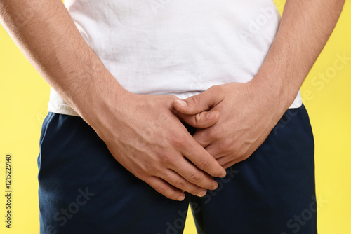 STD (sexually transmitted diseases). Man suffering from symptoms on yellow background, closeup