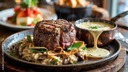 Steak main course pepper-crusted filet mignon on mushroom risotto with crispy onions and creamy sauce in rustic restaurant setting