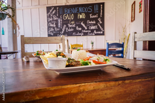 steak served in a restaurant dish with frites and rice