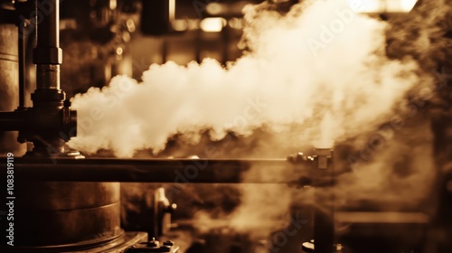 Steam billows from a vintage industrial pipe.