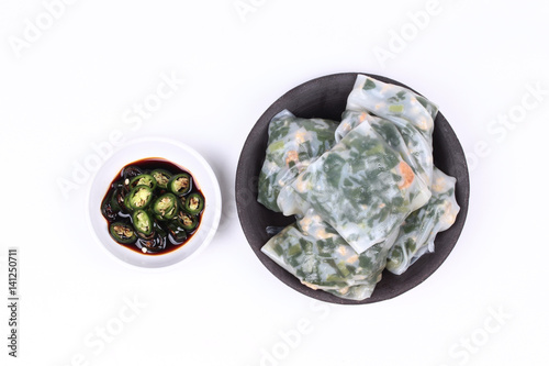 Steamed Dumpling stuffed with garlic chives with spicy soy source.