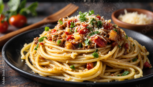 Steaming Amatriciana pasta in cozy kitchen setting, culinary delight