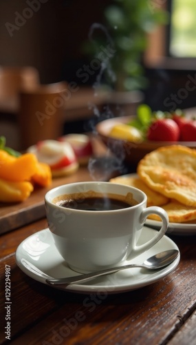 Steaming black coffee and abundant breakfast buffet items, bread, abundant food