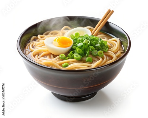 Steaming bowl of ramen noodles with egg and scallions, served with chopsticks, isolated on white background