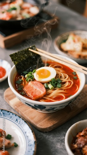 Steaming bowl of ramen with soft-boiled egg, nori, and chashu pork, served with chopsticks and side dishes