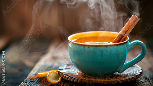 Steaming cup of masala chai with a cinnamon stick. Aromatic Indian spiced tea.