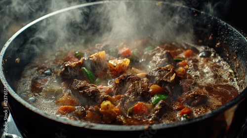 Steaming Hot Beef Stew in a Cast Iron Pan
