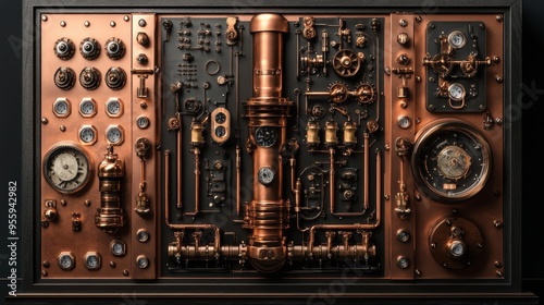 Steampunk-inspired device featuring large copper boards, antique gears, and brass elements, all connected in a complex yet elegant design