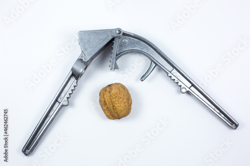 Steel nutcracker and crushed Walnut on white background.