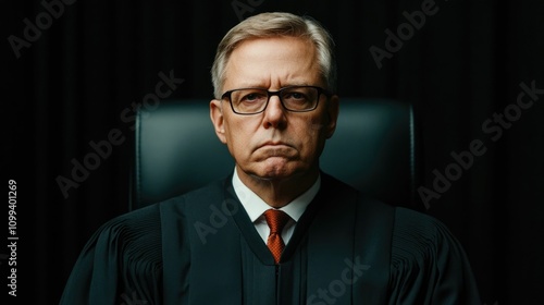 Stern Faced Judicial Official Upholding Legal Fairness and Justice in Courtroom Proceedings Serious Looking Judge Presiding Over Court Case Enforcing Laws and Regulations