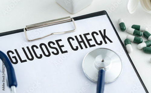 Stethoscope and white card with GLUCOSE CHECK text on blue background. Medical concept.