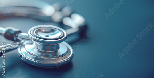 Stethoscope close-up on a uniform blue background. International Nurses Day. Banner. Copy space