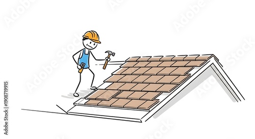 Stick figure construction worker installing shingles on a house roof with a hammer.
