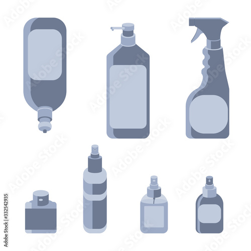 Sticker set mockup on white isolated backdrop. Antiseptic bottles for social banner, hygiene promotion, medical poster. Household goods store logo or info card. Minimal style stock vector illustration