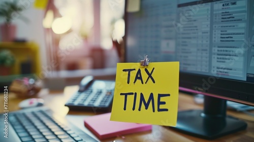 Sticky note with "TAX TIME" written on it, attached to a computer monitor in a home office setting generative ai