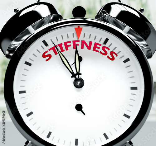 Stiffness soon, almost there, in short time - a clock symbolizes a reminder that Stiffness is near, will happen and finish quickly in a little while, 3d illustration