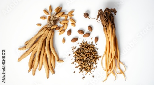 Still life of nuts, long beans, and scattered nut remnants on a bright white background, top-down.