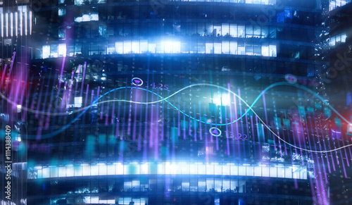 Stock market business concept. Financial graphs and digital indicators with modern city background
