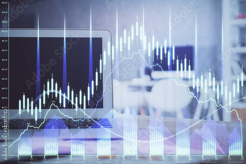 Stock market chart hologram drawn on personal computer background. Double exposure. Concept of investment.