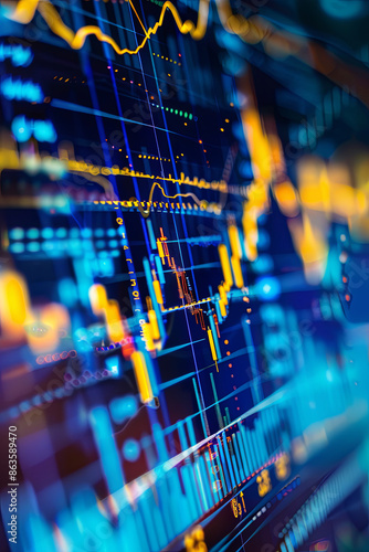 Stock market chart with blue and yellow colors, financial data background