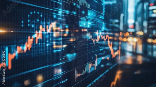 Stock market data displayed on a screen with a blurred city backdrop at night.