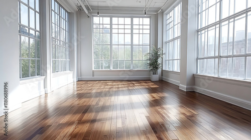 stock photo features an empty room with white walls, hardwood floors, and large windows