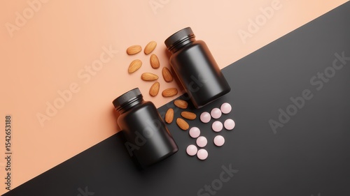 Stock photo of black supplement bottles with almonds and pink pills