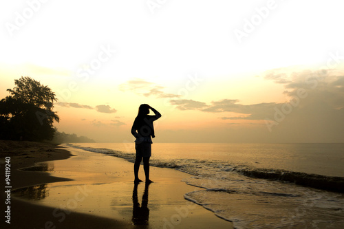 Stock Photo:.Woman standing on a sandy beach and looking to the