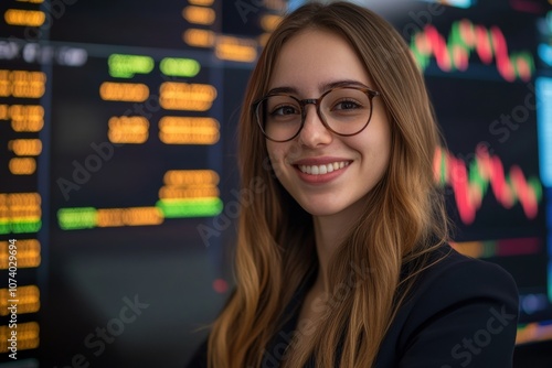Stockbroker smiling at crypto exchange with charts and numbers displayed on screens