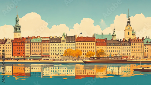 Stockholm, Sweden, french vintage Art Nouveau & Art Deco travel poster template. Cityscape and city skyline.Classic La Belle Epoque vichy art. Clear, simple, trendy