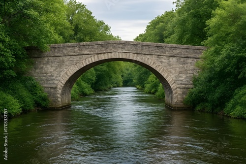 Stone Arch Bridge Over Calm River – Lush Green Foliage in Serene Natural Setting”