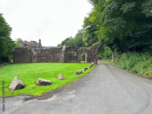 Stone archway, part of Furness Abbey ruins framed by lush greenery, set along a quiet lane