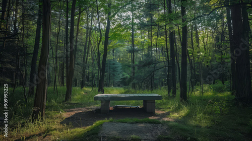 Stone bench in a lush green forest setting.