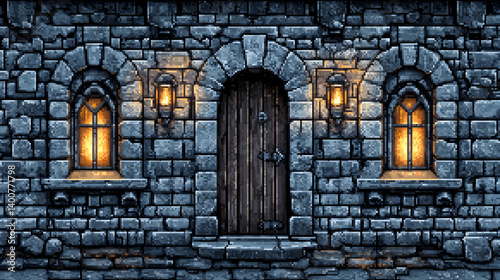 Stone Building Facade with Arched Door and Windows in a Medieval Style Architecture With Glowing Lamps at Night Pixel Art Style