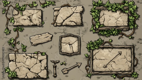 Stone game menu elements with rocky texture, adorned with vines, ropes, and leaves