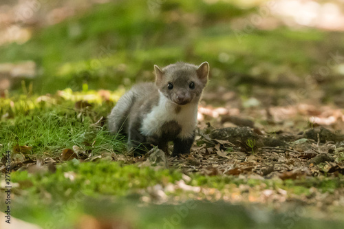 Stone marten, Martes foina, with clear green background. Beech marten, detail portrait of forest animal. Small predator sitting on the beautiful green moss stone in the forest. Wildlife scene, France