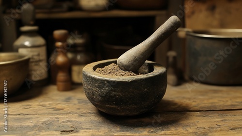 Stone mortar and pestle with ground herbs on rustic wooden table.