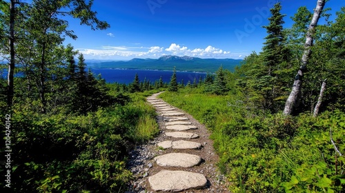Stone path overlooking coastal mountains