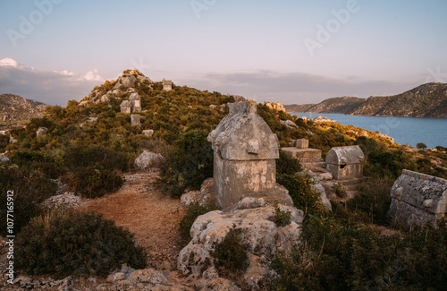 Stone sarcophagus from ancient Simena Kaleköy city in Turkey. Mediterranean sea surrounded by rugged hills listed morning light. Archaeological treasure of Lycia.
