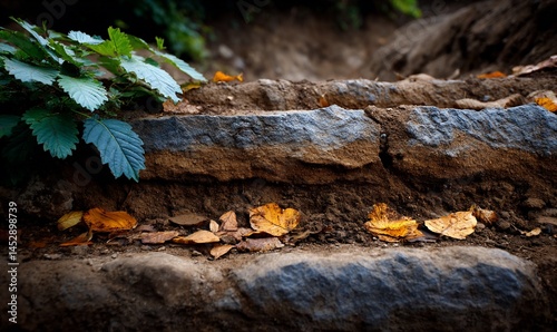 Stone steps in a forest scene, with leaves scattered across the stone surface and nearby greenery