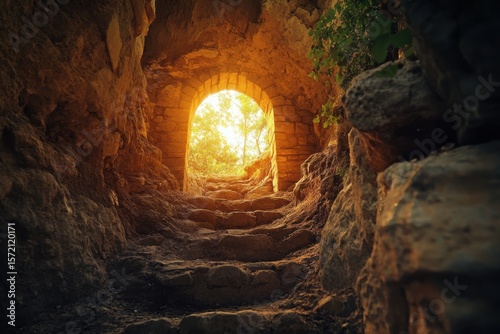 Stone steps leading to a bright archway with foliage in a dark cave like structure outdoors