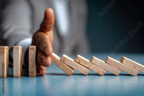 Stop Action Hand Preventing Domino Blocks from Falling - Symbol of Control and