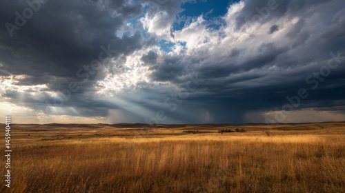 Storm clouds loom over prairie as golden light pierces through, nature's dramatic contrast unfolds