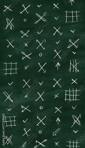 Strategic game planning visualized as chalk tic tac toe arrows on a modern green chalkboard concept