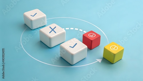Strategic path concept: Visualize an innovative business strategy with graphic elements. Cubes depict successful, failed, and pending choices along a path, showcasing decisions in motion.