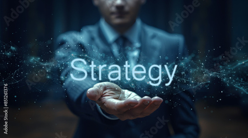 Strategy word on the hand of a businessman. Text symbol concept. Copy space.