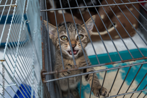 Stray kitten in the cage, with sad eyes and face