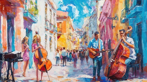 Street musicians perform melodious tunes in a vibrant autumn setting, showcasing their talents in a bustling urban area